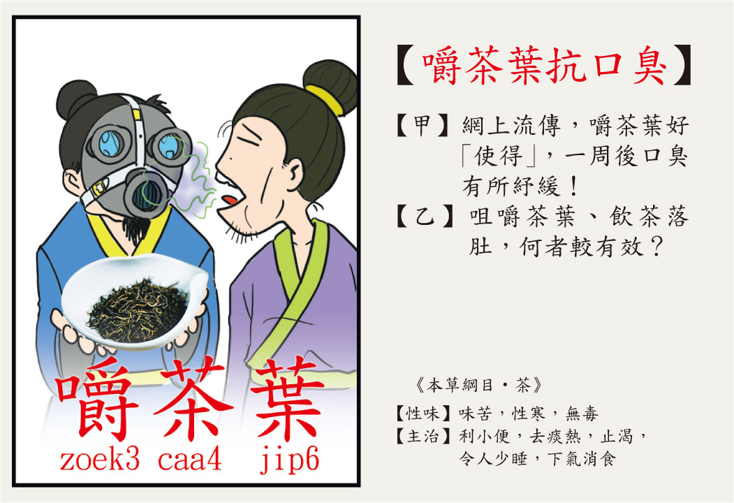 口臭嚴重,為解決滿嘴「沙林毒氣」,只好努力飲水,噴口氣清新劑,可惜治標不治本。網上流傳:每天咀嚼茶葉,嚼出汁液後吐掉,治標又治本,到底是否屬實?