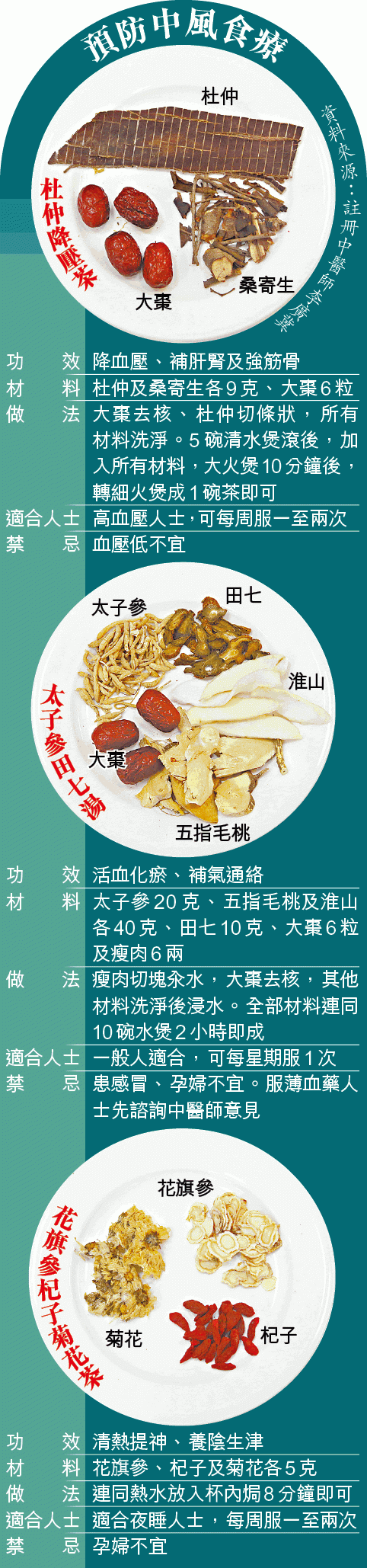 李指推介三款可預防中風食療,其中「太子參田七湯」,田七可通脈行瘀,五指毛桃可補氣,整個湯水有活血化瘀、補氣通絡功效。高血壓人士可飲用「杜仲降壓茶」,此茶有助降血壓、補肝腎及強筋骨。上班族則可在辦公室焗杯「花旗參杞子菊花茶」,有助清熱提神、養陰生津,其中菊花可平肝明目、杞子助補肝腎。此外,肝火重及肝鬱人士,即易面紅耳熱、高血壓或情緒低落者,可用玫瑰花、胎菊各3克,以熱水泡5分鐘後飲用,有疏肝解鬱功效,但孕婦不宜。