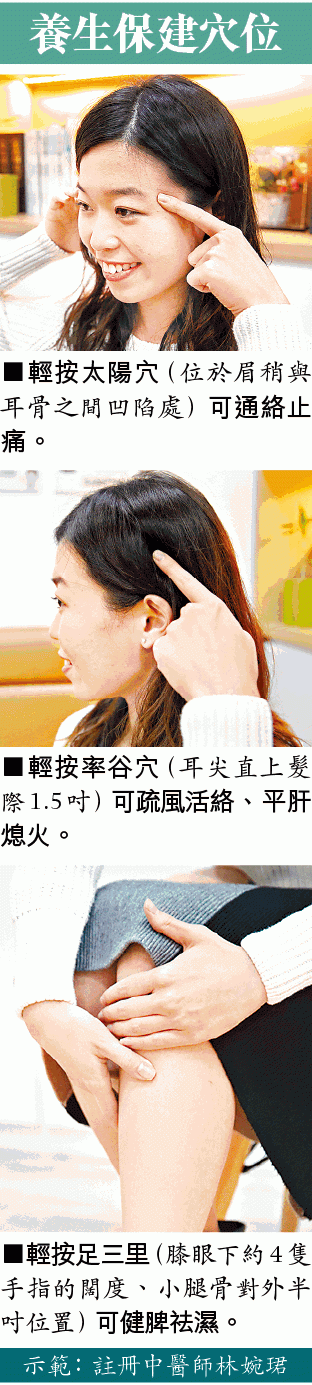 穴位按摩亦有養生保健及防病作用,三個推介穴位包括頭部的太陽穴、率谷穴,以及小腿的足三里,可改善正氣、改善脾胃,減輕頭痛及減少感冒,李建議用手指的指腹輕按3分鐘。另外,可用指腹梳頭,有疏通氣血、醒腦開竅作用。雙手十指打開,然後慢慢由前面梳到後髮際,可做1分鐘。由於頭部的穴位眾多,指腹梳頭、按頭都有預防脫髮作用。