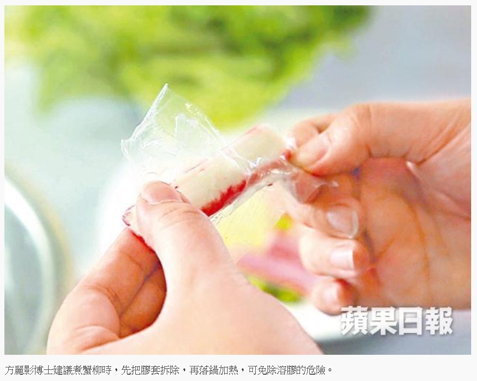 香港專業教育學院食品科技及安全課程主任方麗影博士叫大家不用過份恐慌,「當你把這膠料放入去煮,膠料會變形變軟,甚至有機會會有少許膠料溶出,但絕不足以令你生癌。」她補充,蟹柳的包裝膠料一般能抵受高溫約攝氏100度,加上量少不足以致癌,因此放入鍋打邊爐危險性不大。但始終不是食物,而且加熱時有可能溶膠而對人體有害,故建議最好把蟹柳先拆膠套後煮食。