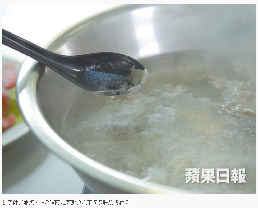 「浮渣多少,視乎打邊爐用的食材種類。假如肉類或海鮮較多,出現的浮渣會較厚,因為肉類和海鮮含較多蛋白質,肉類同時含較多脂肪,湯面有浮渣之餘,亦可能會出現一層油份。」大家不用太擔心,浮渣出現並非因為不乾淨。不過,為了健康着想,把浮渣隔走可避免吃下過多脂肪或油份。