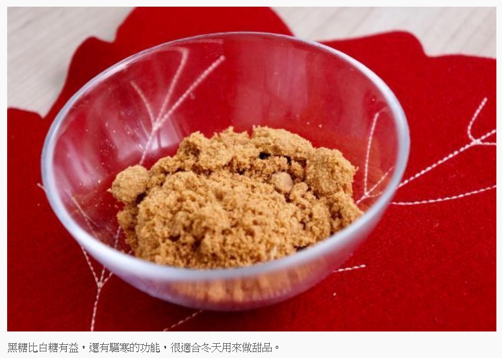 黑糖是沒有經過精煉、脫色的蔗糖,比白糖有益,含有對人體有益的礦物質和微量元素,還有驅寒的功能,味道帶有特殊的甘甜香味;合桃營養也非常全面,當中含有豐富的維他命E,可以滋潤肌膚,所以兩者也是非常適合在冬天做甜品材料。