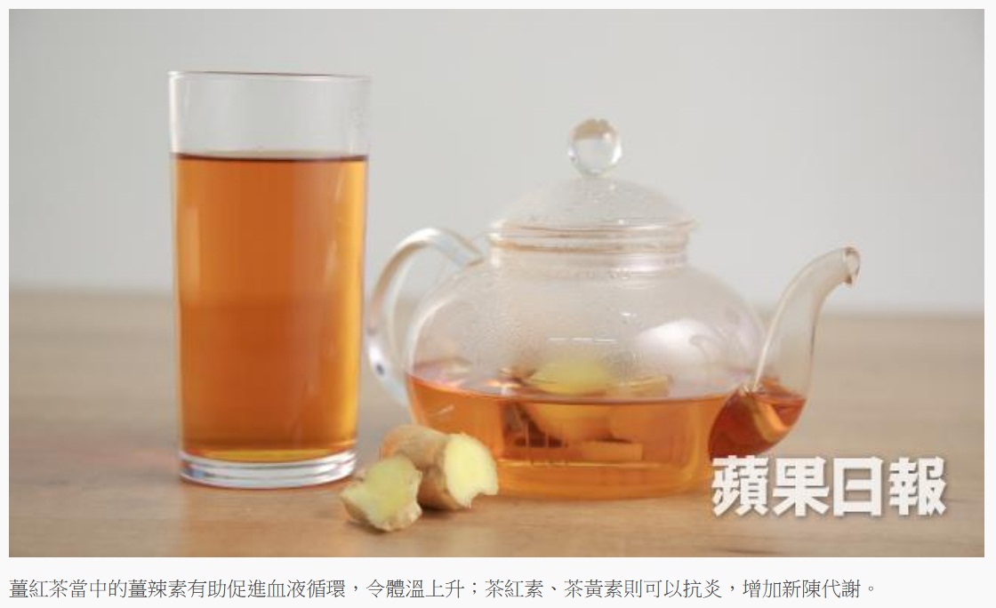功效:薑辣素有助促進血液循環,令體溫上升;茶紅素、茶黃素則能抗炎,增加新陳代謝