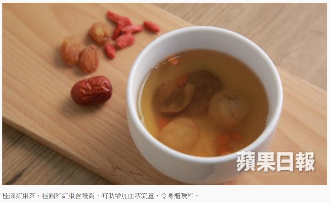 功效:桂圓和紅棗含鐵質,有助增加血液流量,令身體暖和