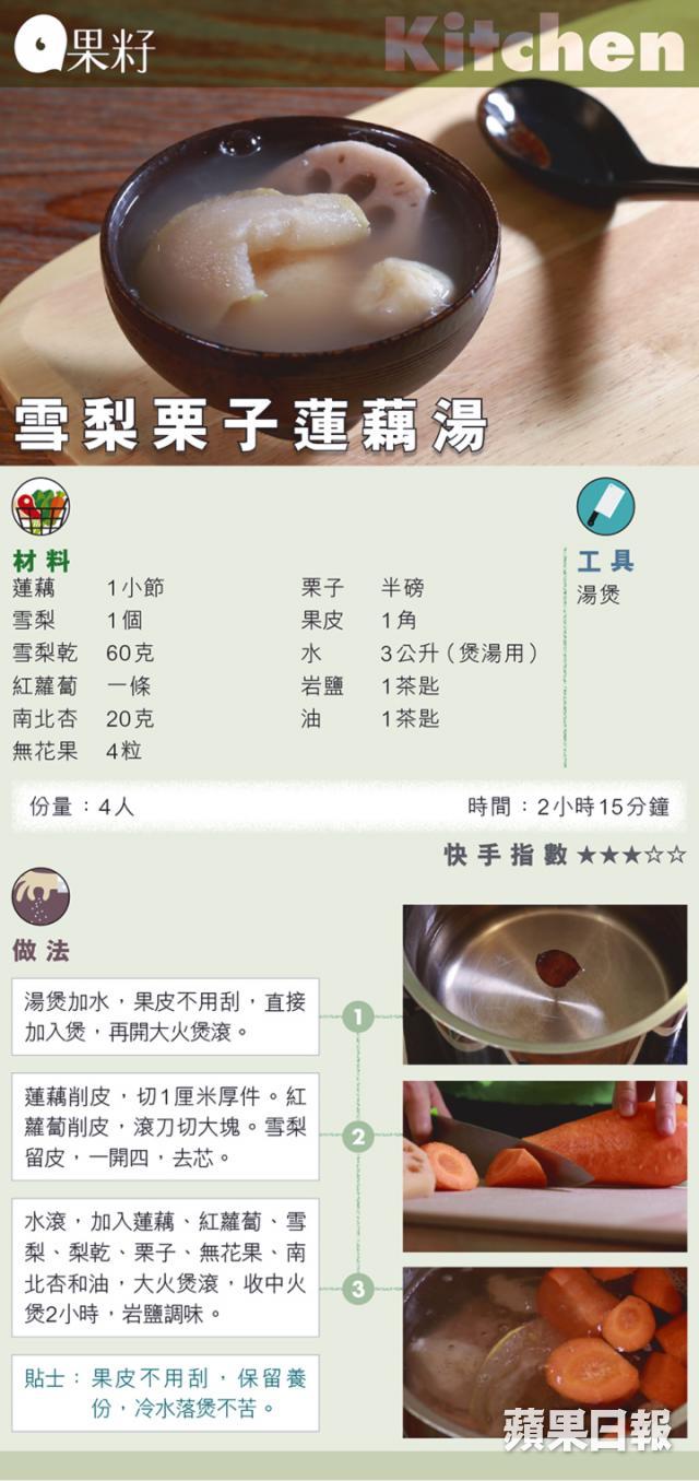 最近身邊不少人咳嗽,這時候最適合多喝湯滋潤一下。「素媽媽」張韻兒提議了一個合時的湯水,就是雪梨栗子蓮藕湯,這湯水用兩種不同質地的梨煲,梨乾味道比較甜,鮮梨味道比較清,加起來煲湯更加清甜滋潤。