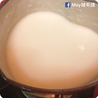 過濾後的杏汁加入約700毫升水份和適量冰糖煮溶,最後加入蛋白煮滾即成。