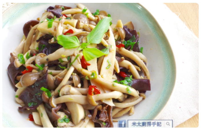 把杏鮑菇和黑木耳切絲,本菇和茶樹菇撕成一條條,加入汁料拌勻即可享用!