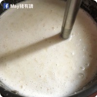 第4步 - 過濾後的杏汁加入約700毫升水份和適量冰糖煮溶,最後加入蛋白煮滾即成。