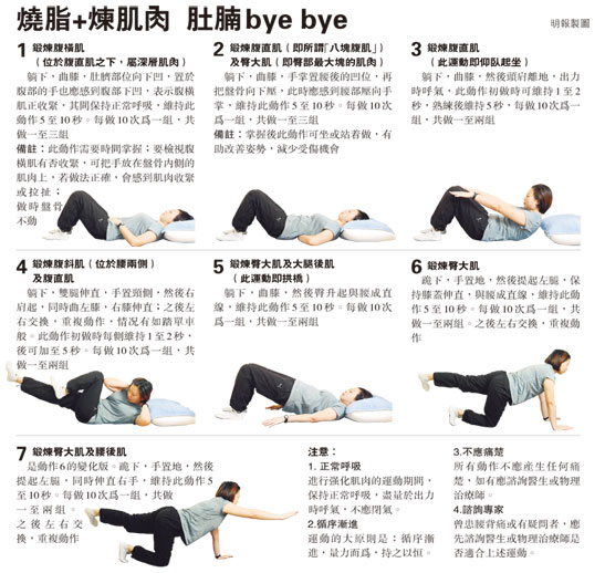 蘋果身形人士腹部不單積聚脂肪,而且腹肌大多無力。若深層腹肌(例如位於前腹的腹橫肌)太弱,便不能發揮天然腰封的支撐腰椎功能,加上長期挺大肚腩,容易腰痛,腰力較遜,也較容易扭傷。因此,大肚腩人士除了做帶氧運動減肚腩,接下來便要做強化腰腹部肌肉的運動,且強化肌肉後,可增加身體肌肉的比例,提升新陳代謝率,加強減肥的效果,本文介紹的運動便是專門針對這方面而設。