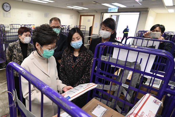 林鄭月娥在運作中心了解該署如何透過調配人手和調整工時,應對疫情期間急增的抵港郵包數量,其中不少載有口罩等防疫物資。自農曆年後至今,該署已完成派遞逾16萬件載有口罩的郵包予市民。