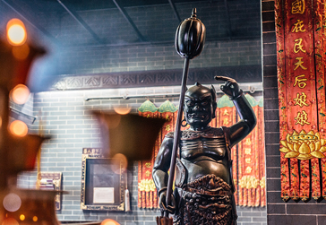 黃昏剛至,筲箕灣一座低矮古廟香煙繚繞。廟裡,一位老婆婆正在燒香敬拜香港人崇敬的神祗 —— 海上女神天后(即媽祖)。在中國神話中,天后原是生於宋朝的福建婦女,因在一次颱風海難中救了出海打魚的父親和兄弟而得道成仙。如今,全港有100多座天后廟,其中大部分位於舊時漁民的居住區,筲箕灣就是其中之一。