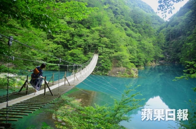 於奧泉站可轉乘公共巴士至被萬山包圍的寸又峽溫泉鄉,當中的「夢之吊橋」,橋下水面呈翡翠綠色,儼如世外桃源。